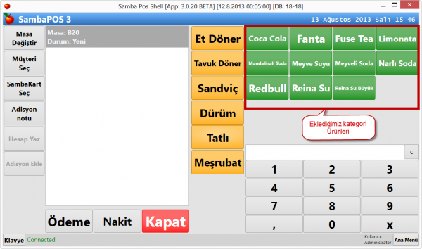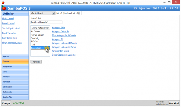 Menü içerisinde yer alan Kategoriler; satış ekranında orta sütunda bulunan ürün kategorilerini temsil eder.