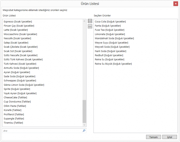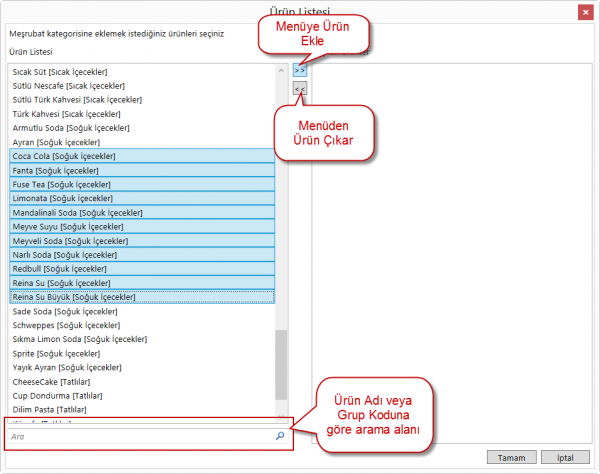 Ürün Ekleme Çıkarma penceresi içerisinde Sol Sütünda bizim Ürünler Menüsü içerisinde tanımladığımız tüm ürünler listelenmektedir.