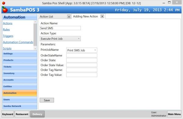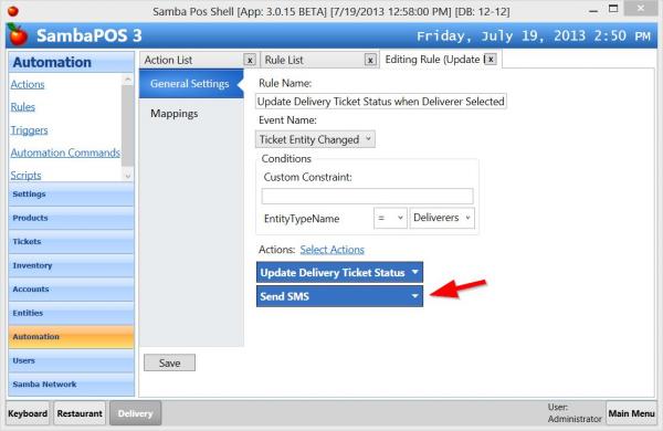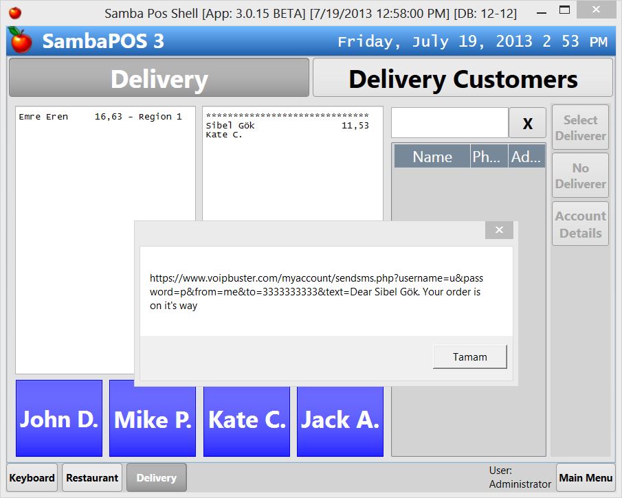 Hello. On this documentation we'll integrate sending SMS function to SambaPOS Custom Package Delivery sample configuration. We want to send SMS to a customer when we assign deliverer to a ticket to notify them their package is delivered.