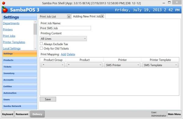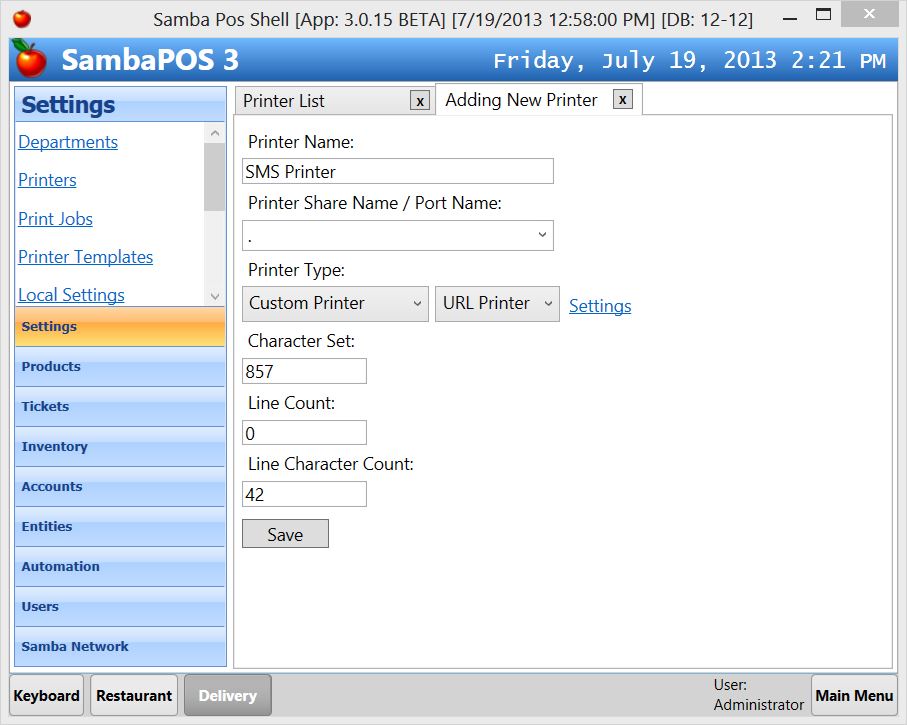 We'll start by configuring a new Printer called SMS Printer. Add a new printer from Management > Settings > Printers.
