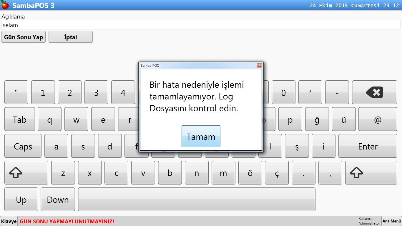 "bir hata nedeniyle tanımlanamıyor , log dosyasını kontrol edin diyor " gün sonu alamıyorum