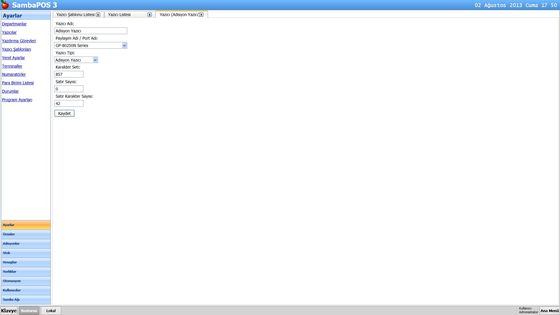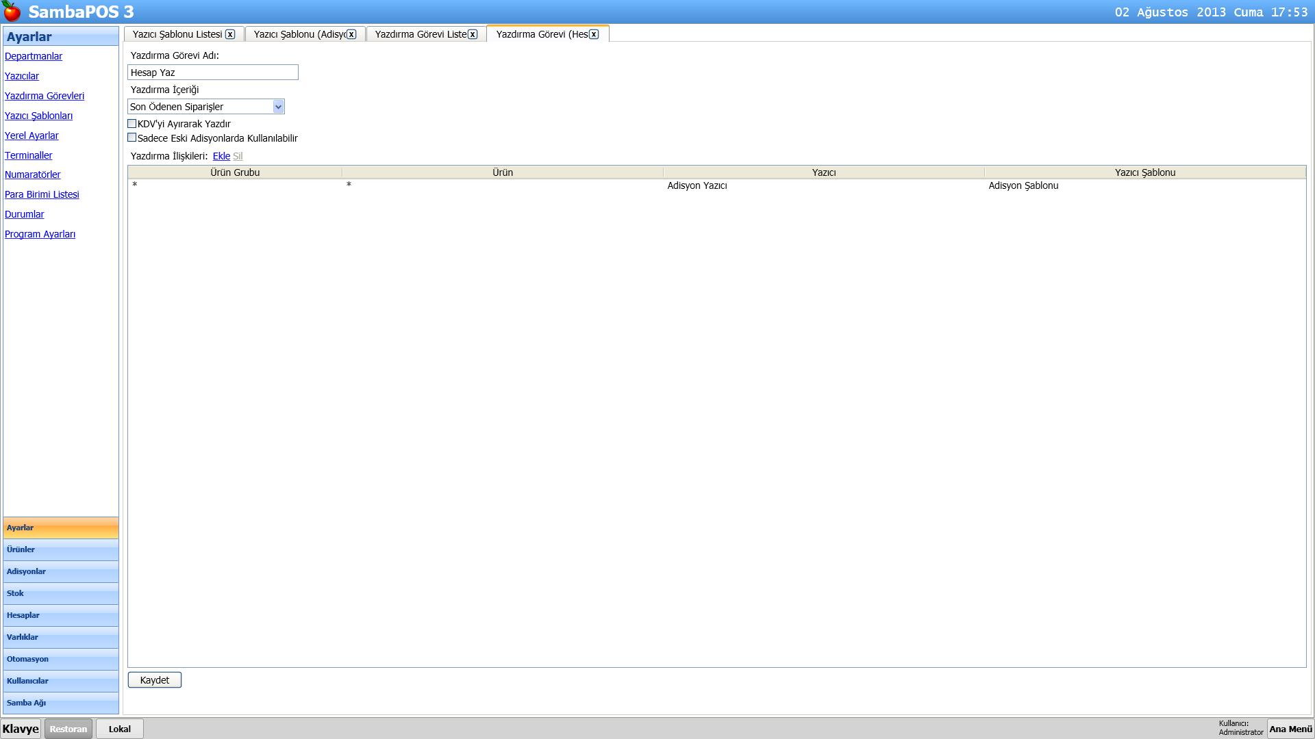 Serkan selamlar. Bunun pek çok nedeni olabilir. Yazıcılar sekmesinden "Adisyon Yazıcısı", Yazıcı Şablonları sekmesinden "Adisyon Şablonu", Yazdırma görevleri sekmesinden de "Hesap Yazdırma" görevinin ekran görüntülerini alıp buraya koyabilir misin?