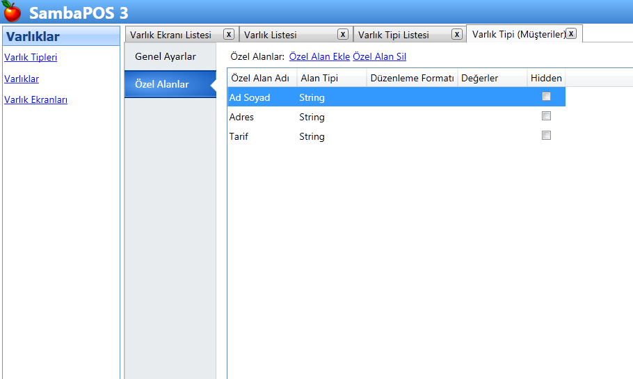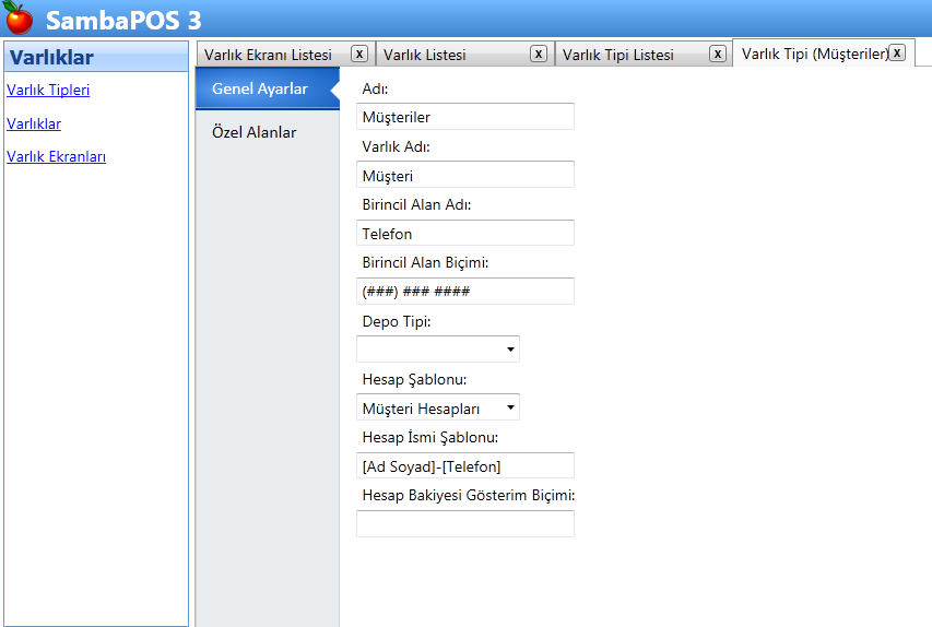 Selamlar. Varlık tiplerinden müşteri varlığının ayar ekranını ve özel alanlar bölümünü resim olarak paylaşabilirmisiniz.