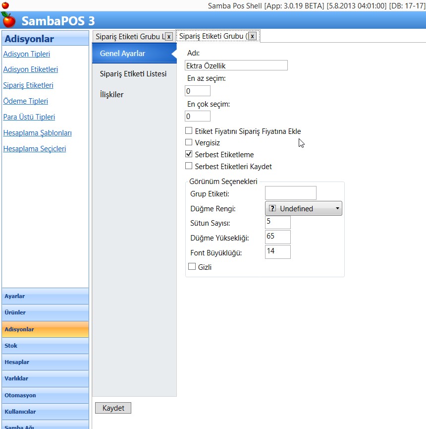 İlk olarak adisyonlar >> sipariş etiketleri >> sipariş etiketi grubu ekleye tıklıyoruz ve ekstra özellik adında sipariş etiket grubu oluşturuyoruz