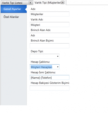 Varlik tiplerinden musteri varlık tipinin ayarlarının ve özel alanlarinin resmini koyabilirseniz sorunu cozebiliriz