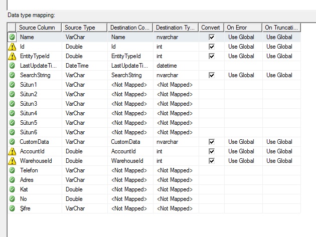 abi aynı isimlerde sütünlar var zaten. telefon kat no ve sütün 1 2 3 ler custon data yı oluşturmak için var. yani customdata sütünu sutun1&telefon&sutun2&adres olarak gidiyor. onları sql e aktarmaya çalışmıyorum zaten. account id ve warehauseid ler sıfırla dolu entitytypeid 1 le dolu id ise 100 den başlayarak 1 er artarak gidiyor. kendi içinde kaydettiğim hesapları excel e aktarıp ordan çıkan verilere göre düzenledim hepsini zaten. ancak sorun şuki kendi oluşturduğu exel i yüklerkende aynı hatayı veriyor.