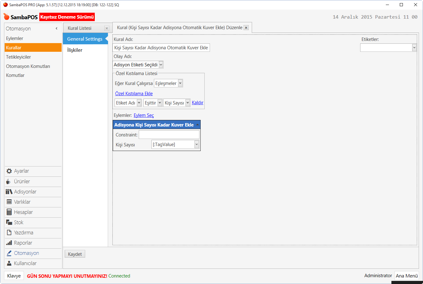 Özel bir Kısıtlama Ekleyerek hangi Etiket seçildiğinde olacağını da tanımladıktan sonra az evvel oluşturduğum Eylemi Kural ın içine atıyorum, ve özeliklerinde az önce benim yazdığım Kişi Sayısı geldiğini göreceksin. Burada da Etiketin değeri kadar dediğimde hafızasında olan Etiket değerini alıp, Ürün müktarı ile çarparak Adisyona ekleyecek.