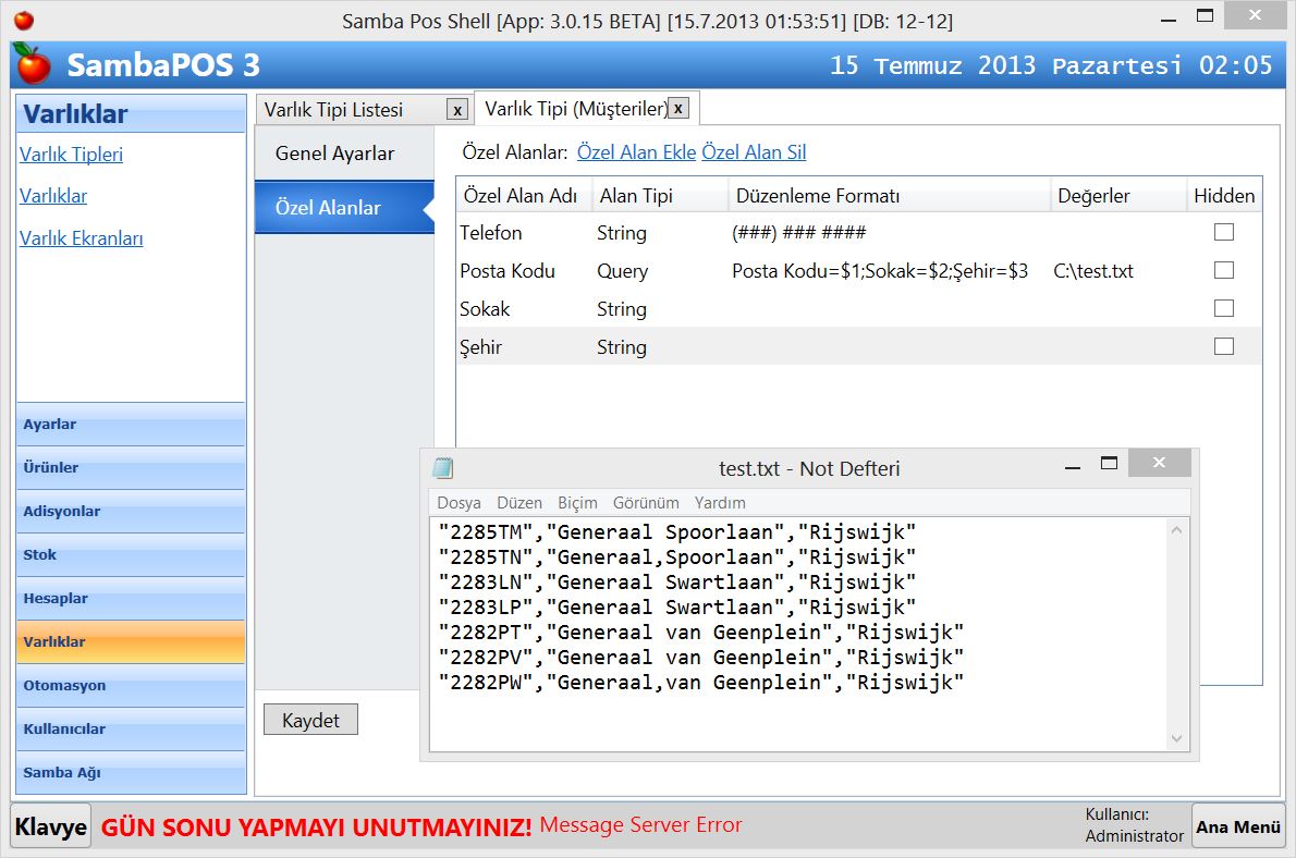 Arka planda ise SambaPOS'un özel ekran tasarım alanını görmektesiniz. Burada üç adet alan ekledim. Birincisi Posta Kodu ve alan tipi "Query". Diğer ikisi ise Sokak ve Şehir. Bunlar normal düzyazı (string) tipinde alanlar.