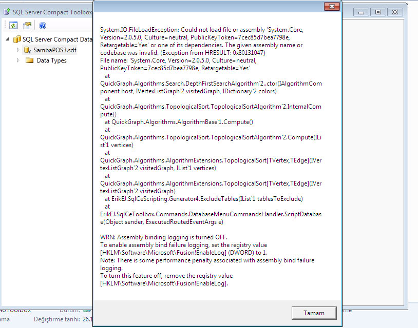 SQL Server Compact Toolbox programının en son versiyonu kullanıldığında farklı ayarlar yapmak gerektiği ve o ayarlar yapılmadığı için hata verdiği oluyor, ancak aşağıdaki linkte yer alan versiyonu kullanırsanız herhangi br hata almadan .sql dosyaları oluşturabilirsiniz.