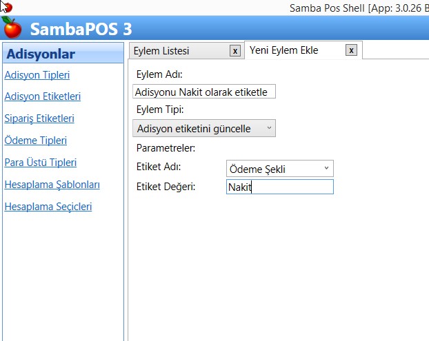Tamam anladım. Adisyon etiketini değiştiren bir eylem ekliceksiniz ve bu eylemi belge oluşturma kuralına ekliceksiniz. Böylece oluşturduğunuz her adisyon nakit olarak işaretlenecek. Müsait bir zamanimda resimli olarak yardimci olurum