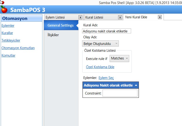 Bu eylemin ne zaman yapılacağını belirten birde kural eklemelisiniz. isterseniz adisyon oluşturulurken isterseniz kapanırken isterseniz adisyona sipariş eklenirken çoğu şekilde etiketleme için bir olay seçebilirsiniz.