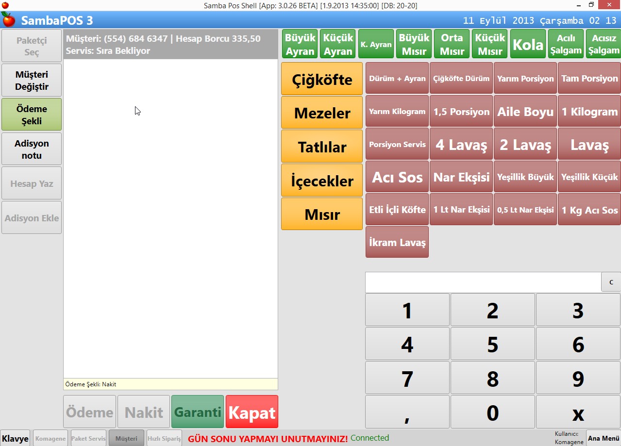 Ve sonuç olarak aşagıdaki gibi adisyon oluşturulduğunda otomatik olarka ödeme şekli nakit olarak seçiliyor. bunu adisyonda nasıl yazdırıldığını zaten biliyorsunuz. selametle.