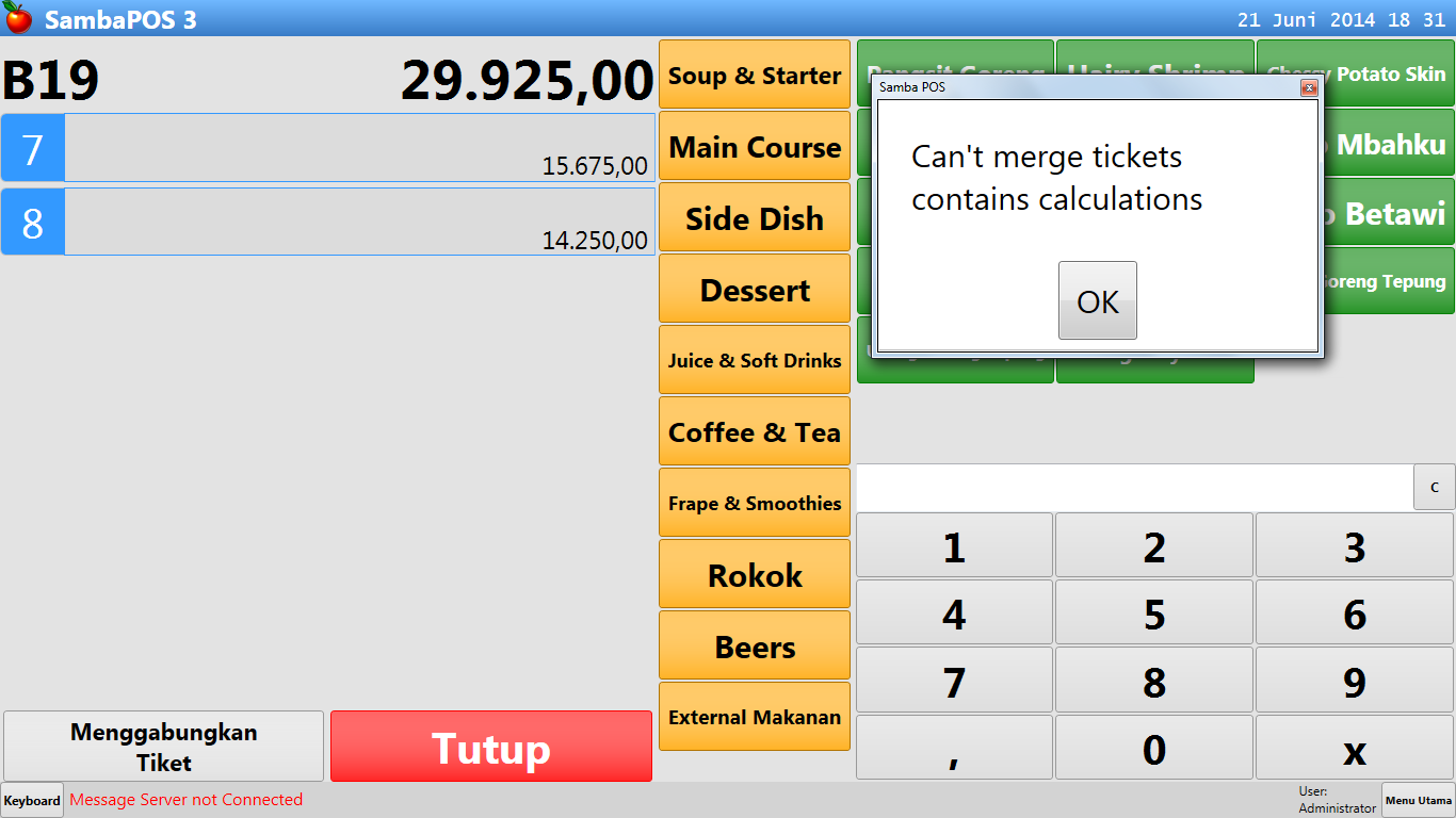 I move a customer from one table to another, no problem I then have two tickets on that table, then I highlight both the ticket numbers on the left and click Merge Tickets - message comes up "Can't merge tickets contains calculations"
