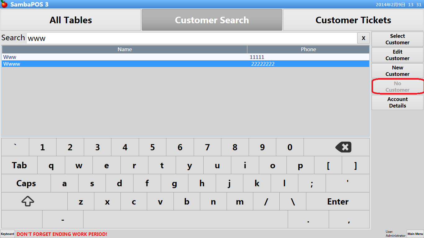 I create 2 customers with account,but in customer search screen,the "no customer" button is  not  light up