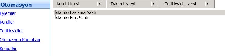 Benim anlattığım yöntemde iskonto girmiyorsunuz. Belirli saatler arasında örneğin 13.00-15.00 arasında fiyatları değiştiriyorsunuz. yani 10 liralık ürünün fiyatını 8 yada 9 tl yapıyorsunuz. ilk resimdeki yerdeki olay adı yazan yere 3. sıradaki tetikleyici çalıştı yı seçeceksiniz. özel kısıtlama olarak işkonta başlama saatini seçeceksiniz. eylem olarak fiyat etiketi değiştir seçeceksiniz. eğer yoksa eylemlerden oluşturmanız gerekmektedir. Şuan için resimli anlatım yapamıyorum malesef.