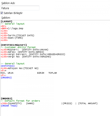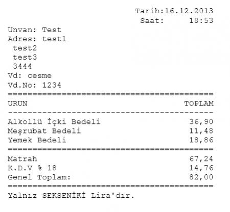 Dot Matrix Slip yazıcı uyumlu (%18 kdv) şablon örneği. Varlık Adını ve ek alanları kullanmadan önce tanımlamalısınız. Ayrıca Ürünlere etiket girmelisiniz. Alkollü içki, Yemek vb.