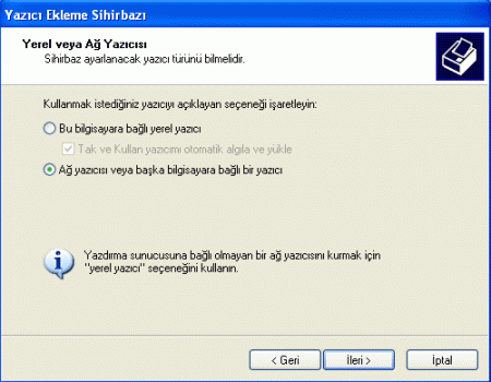 2-İleri Tuşuna Basıyoruz.Ağ yazıcısı veya başka bilğisayra bağlı yazıcı seciyoruz.İleri tıklıyoruz