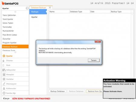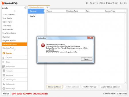Çözümü, yedeğinizi SQL Server'ın kurulu olduğu dizin içindeki Backup Klasörünün içine kopyalayın, ve SambaPOS da Database Backup modülünde Ayarlar kısmında Backup klasörü olarak bu dizini seçin.