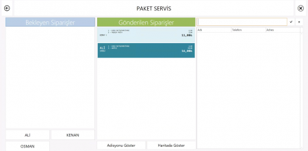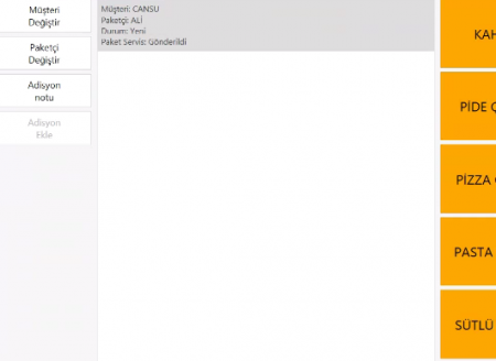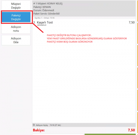 Adisyona ürün ekliyorum kapat dediğimde herhangibir sıkıntı yok paket servisten paketçiyi seçiyorum..Eğer Adisyon içinden  Paketçi Değiştir Butonuna tıklarsam gönderilen paket olarak  gösteriyor paketçi ismini boş getiriyor paketçiyi tekrar değiştiremiyorum.