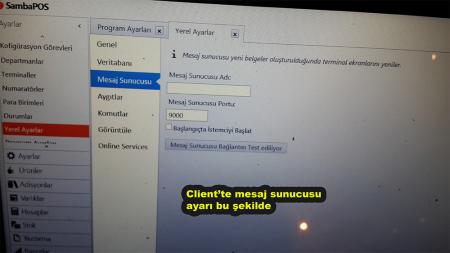 ana bilgisayarda mesaj sunucusu servisini çalıştırıp port 9000+ yaptım. servis aktif halde çalışıyor. zaten sambapos girincede bağlandı yazısı mevcut aşağıda.