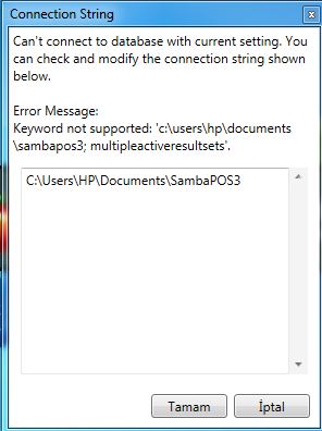 data source=C:\Users\HP\Documents\SambaPOS3\SambaPOS3.sdf olarak yazarak deneyin.