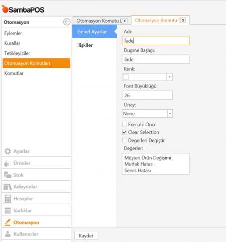 İade'lere sebep yazmak için; Yönetim > Otomasyon > Otomasyon Komutları içinde İade üzerine bir kere tıklayıp Düzenle linkine tıklayarak butonun özelliklerini açın ve Değerler kutucuğuna ilgili sebeplerinizi her birini bir satıra gelecek şekilde yazın.