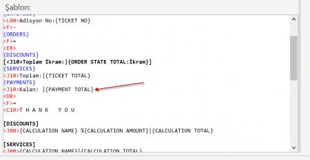 <J10>Kalan: |{PAYMENT TOTAL} eklerseniz Kalan tutarıda görebilirsiniz.