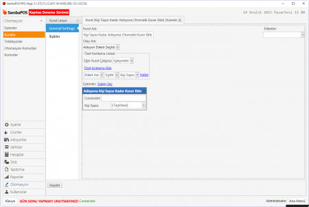 Özel bir Kısıtlama Ekleyerek hangi Etiket seçildiğinde olacağını da tanımladıktan sonra az evvel oluşturduğum Eylemi Kural ın içine atıyorum, ve özeliklerinde az önce benim yazdığım Kişi Sayısı geldiğini göreceksin. Burada da Etiketin değeri kadar dediğimde hafızasında olan Etiket değerini alıp, Ürün müktarı ile çarparak Adisyona ekleyecek.
