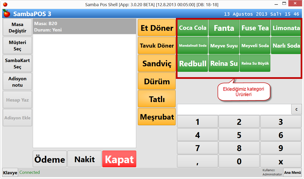 Menü içerisinde yer alan Kategoriler; satış ekranında orta sütunda bulunan ürün kategorilerini temsil eder.