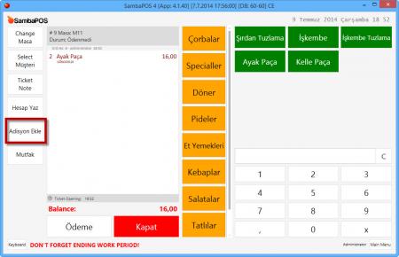 Masa icin masa adisyon sistemi tamam. Tarif ettigim "take-away" sistemi icin bir departman ve masaya bagli olmayan bir adisyon sistemi kurmam gerek. Bu sistemi kismen tanimladim, orneklerden yola cikarak. Ancak, acik olan bir adisyonu kapamadan yenisini acmayi beceremedim. Biraz el yordami ile gidiyorum tabi.