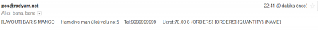 Orders'ın yazması için öncelikli gereksinimleri vardır. Layout başlangıcı gibi. Ben sizin yerinizde olsam, Adisyon şablonunu komle Mesaj içerisine alırım ve fazla olan satırları veya alanları kaldırarak yapardım. Bu sayede ihtiyaç duyacağınız tüm içerikleri de almış olursunuz. Ayrıca bkz. https://www.youtube.com/watch?v=p3ubqtqG9noMehmet bey merhaba Layout ekledim mutfak şablonunu tamamen ekledim fakat siparişi mail olarak gönderemiyorum. ayarlarım ektedir. kontrol edebilirmisiniz
