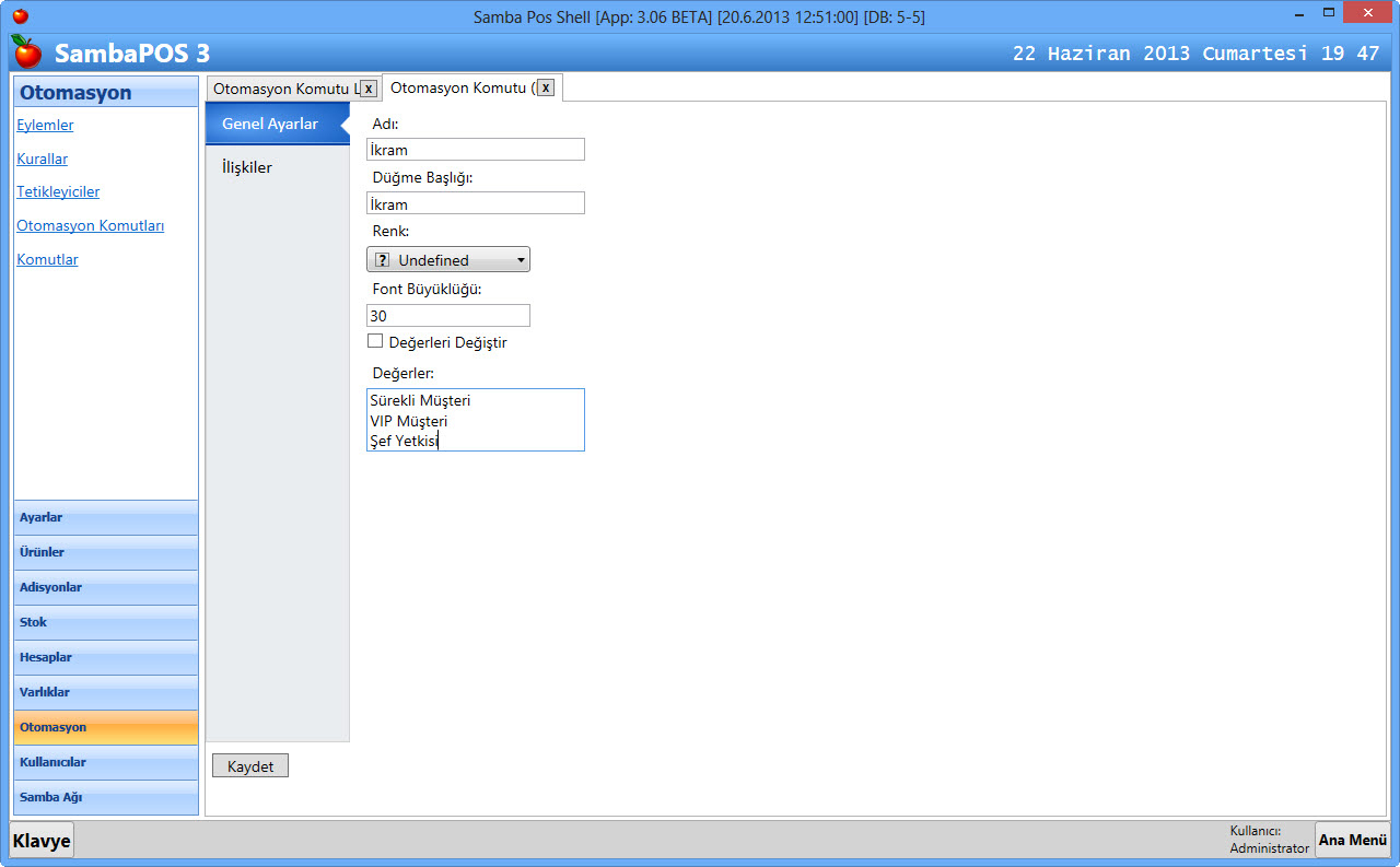 SambaPOS V3 de Ikram Iade gibi işlemler, Otomasyon Komutu olarak tanımlanmaktadır.