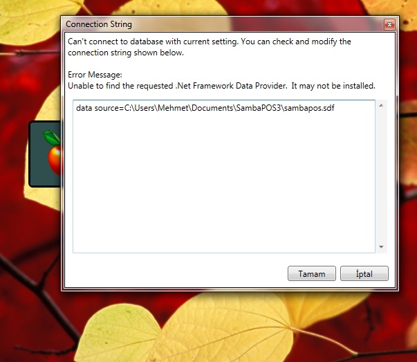 dediğiniz gibi ekrandaki yolu  data source=C:\Users\Mehmet\Documents\SambaPOS3\sambapos.sdf  yapmama rağmen açılmıyor. (kullanıcı adı mehmet)