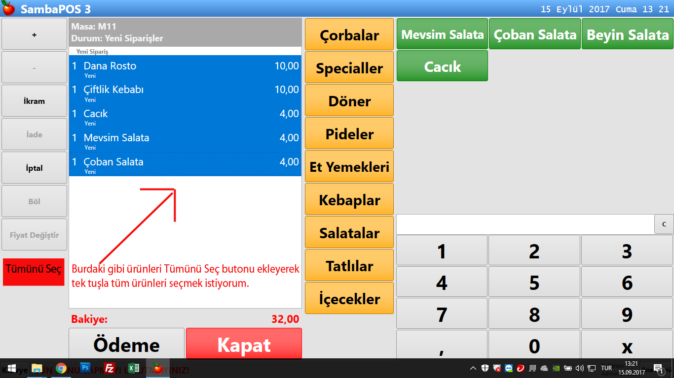 Yeni bir masaya siparişleri ilk kez girerken "Tümünü Seç" diye bir button eklemeye çalışıyorum. Butona basınca masadaki tüm ürünleri seçsin ve tek tuşla iptal edebileyim.. Buttonu otomasyon kısmından ekledim, bayağı da kurcaladım ama tümünü seç ile ilgili bir kural, komut göremedim. Yardımlarınız için teşekkür ederim.