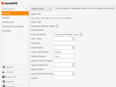 Yönetim > Otomasyon > Eylemler  menüsünde Siparişleri Mutfağa yazdır eylemini düzneleyin ve aşağıdaki gibi Durumu = Yeni olanları yazdırmasını söyleyin.