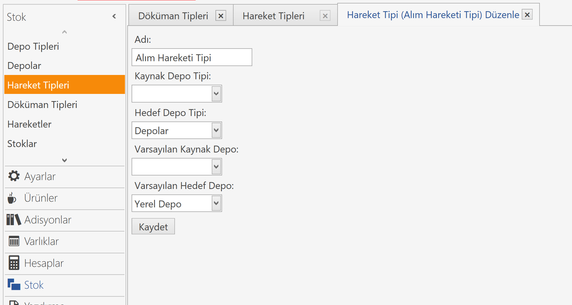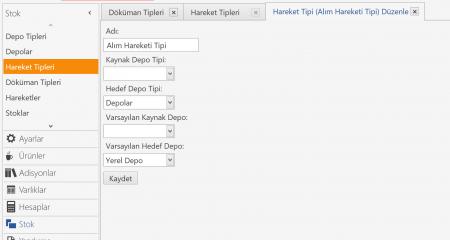 Yönetim > Stoklar > Hareket Tipleri menüsünden hareketinizi kontrol edin