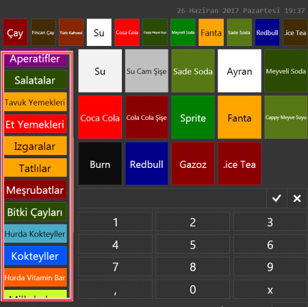 2- Menü listesinde "Menu" Ekran tasarımınızdır. Muhtemelen Ürün listesindeki kategorileriniz, Ekranda gördüğünüz Menü kategorilerinden farklı. Ürün listenizdeki kategorileri Ekranla aynı hale getirin. Raporları hangi kategorilerde görmek istiyorsanız ürün listesindeki Kategorileri de ona göre ayarlayın.