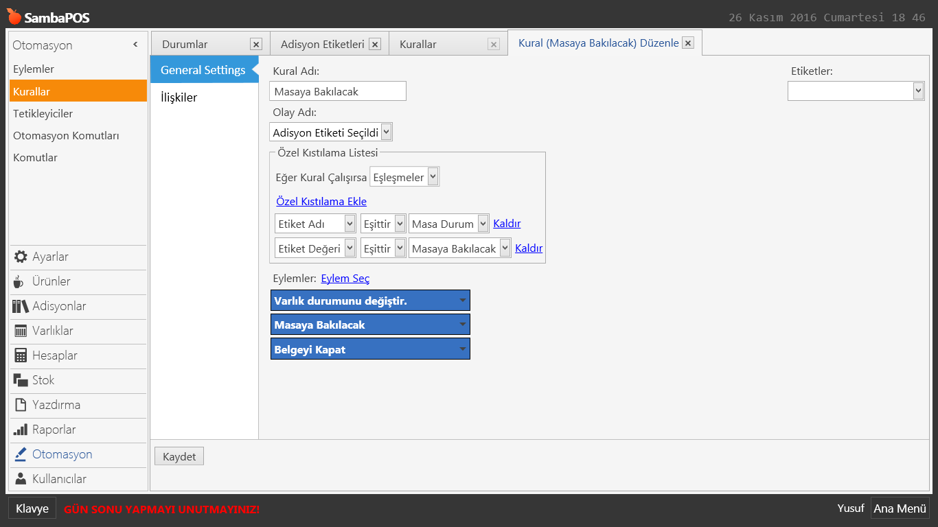 Adisyon etiketi olarak yaptım. Kurallardan masa durumu seçildiğide renk değişmesi için komut verdim. ama otomatikleştirmeyi yapamadım.