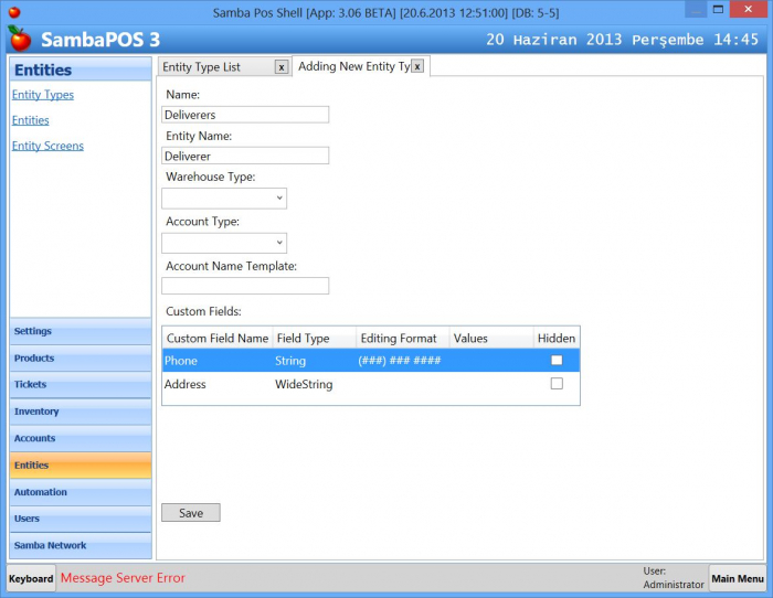 We'll start by creating a new Entity Type for deliverers. We'll have two custom fields for personnel phone and address. You can add more for your needs by right clicking on the grid. Creating a Deliverer Entity Type means we can create Deliverers and assign them to tickets like we assign customers or tables.