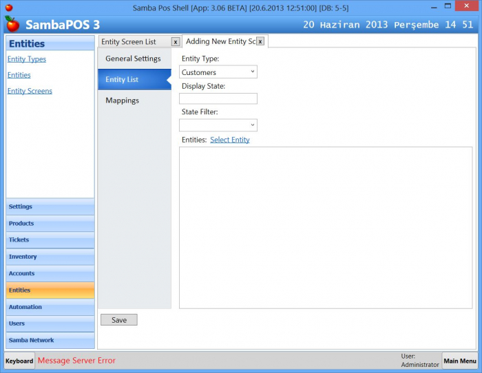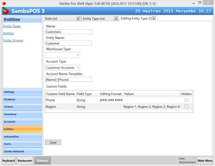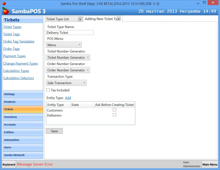 We'll need different ticket type for delivery department. We'll use same menu for delivery and table service departments but you can create different menu with different prices for delivery department if you need. The main reason we need different ticket type is we can differ delivery sales on reports and make finer configuration. While creating this ticket type we'll assign “Customers” and “Deliverers” entity types to this ticket type. This also means we won't use tables with these tickets. Not in the scope of this document but as a side note you can create custom Transaction Type for this ticket type and differ delivery sales accounts. We'll talk about this more on further documents.