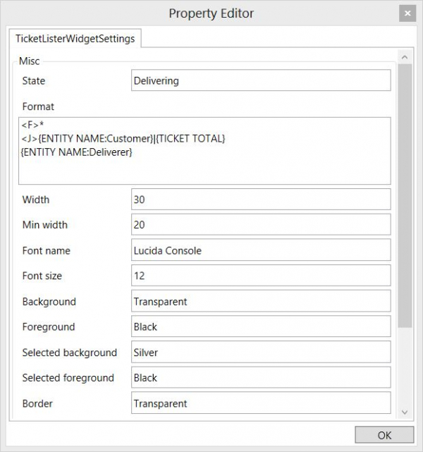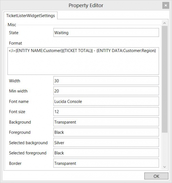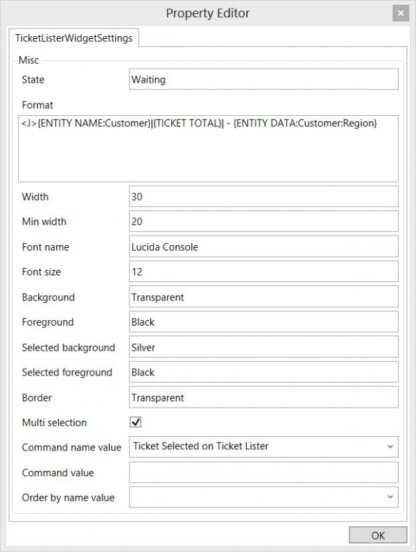 This is the settings screen of Ticket Lister 1. State is Waiting so it will display tickets with “Waiting” state. Format setting is for configuring how ticket displays on the lister. We use “Printer Template” formatting here. Most printer formatting features supported here. So you can configure how tickets displayed like you configure ticket prints. {ENTITY DATA:Customer:Region} will display Customers Region. We'll configure this field on next step.