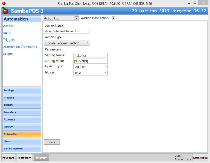 Create a new action, select “update program setting” action type and configure it as shown here. The setting name we are using here is “TicketIds” when we need to read selected ticket ids we'll use {:TicketIds} tag.