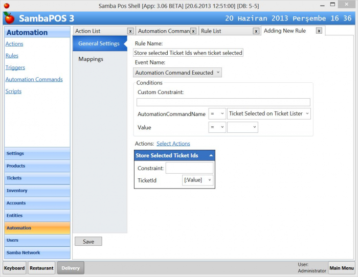 We need another action to change ticket deliverer. This action does it. Please notice this rule also reads selected deliverer name from program settings with {:Deliverer} setting name. We'll store selected deliverer name when we click Deliverer button.