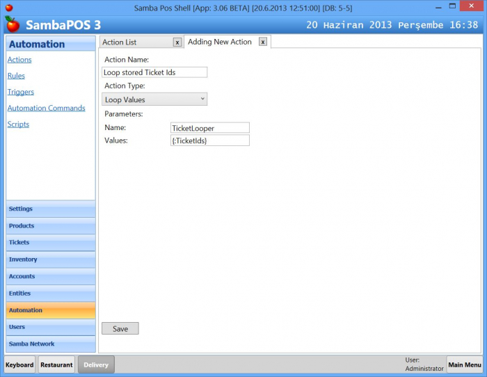This awesome action does looping actions. It reads a value and executes “Value Looped” rule multiple times with supplied values. On this sample it reads selected Tickets Ids from {:TicketIds} tag. When we write a value in curly brackets it reads it's value from program settings. If you remember we stored selected ticket id's to TicketIds setting with “Store Selected Ticket Ids” action. It will read this setting, for example if stored ids are 101,105,109 it will split these values to three and loop these values. In this case three times.