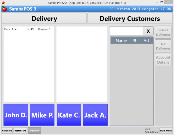 Switch to “Delivery Customers” screen and create a new customer. As you can see I can choose a region from combobox while creating a customer. We forgot adding an address field here but it will be useful if you add it too :) Click Select Customer to create an order.