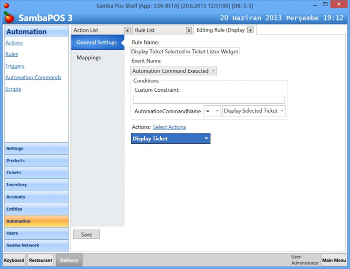 This rule handles Display Selected Ticket automation command and execute Display Ticket action. We'll map Display Ticket parameter to [:Value] too.