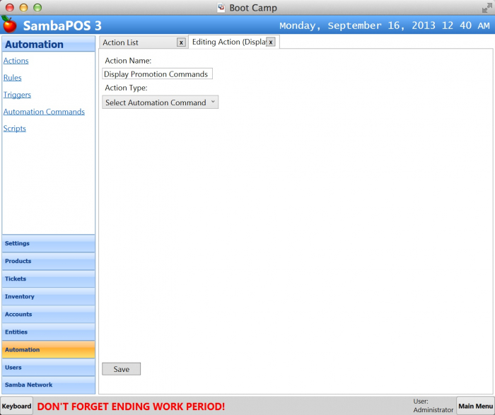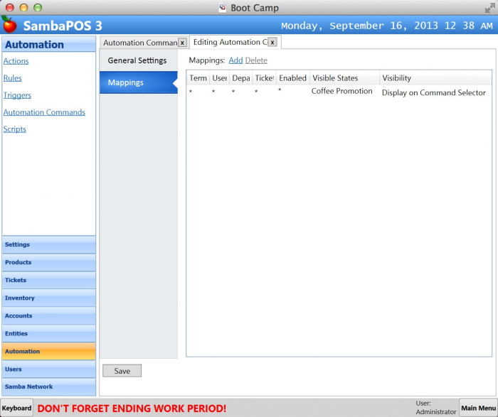 Select Automation Command action displays Command Selector region. This region located where menu items are displayed. Since we’ll update ticket promotion state to Coffee Promotion we’ll see promotion commands there.