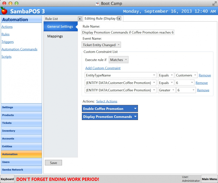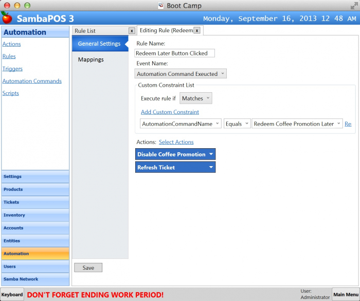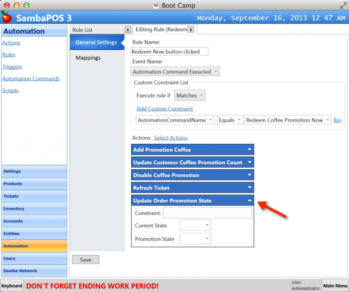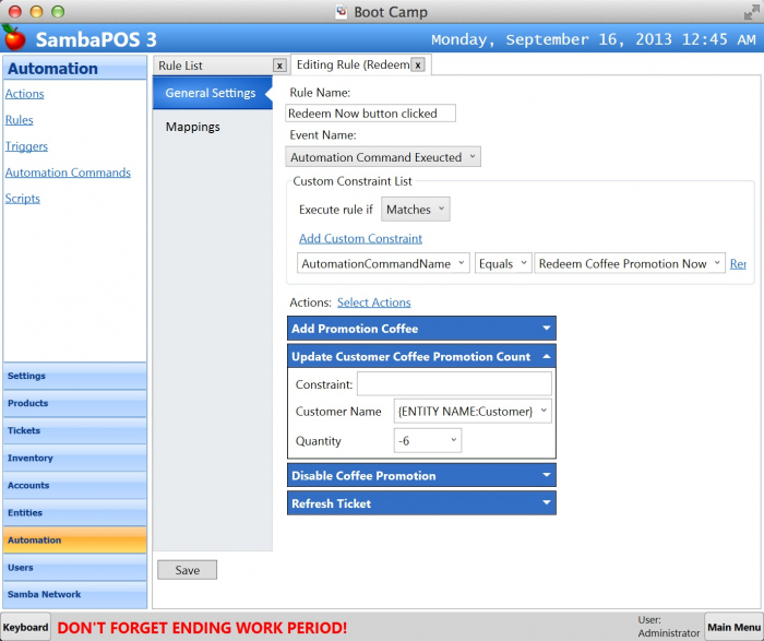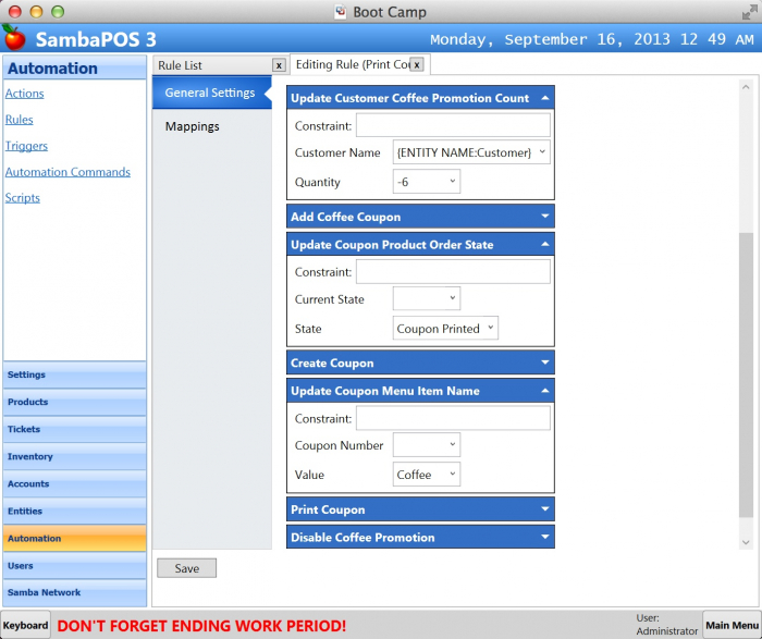 Printing coupon might be better than just canceling promotion. So we already have coupon creating features. We just need to add Coffee Coupon product, mark it as gift and decrease promotion count of customer. If you remember on previous chapter we cancelled coupon printing and implemented text file generation instead. Now we need to print coupon immediately so we’ll handle this case on “Print Coupon Button” Rule.