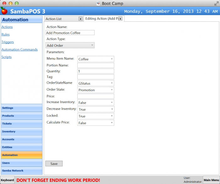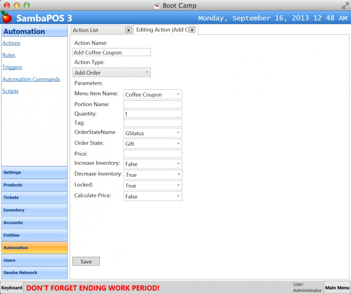 If you followed all steps you already have Add Gift Product action. We can use it to add free coffee in ticket but I’ll create another action to demonstrate different settings. Remember on previous case we redeemed coupon after order submitted. Now we’ll execute promotion immediately and forbid order canceling. You can clone Add Gift Product Action for easier configuration.