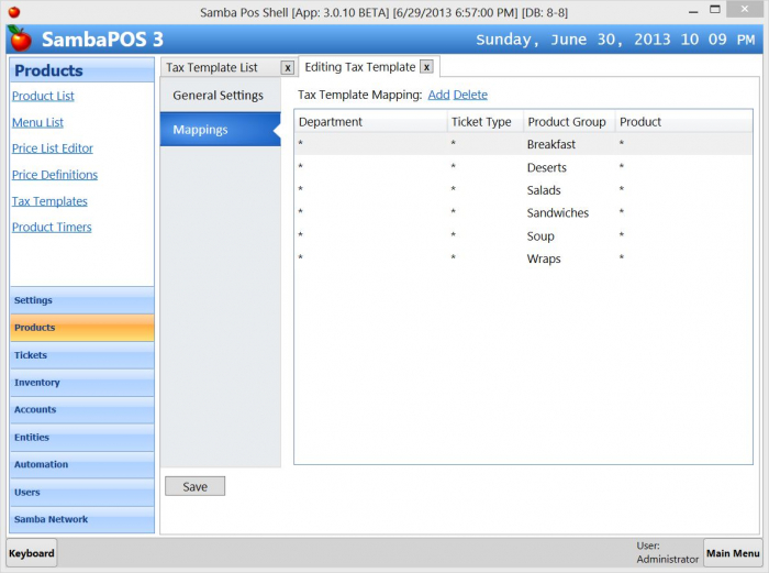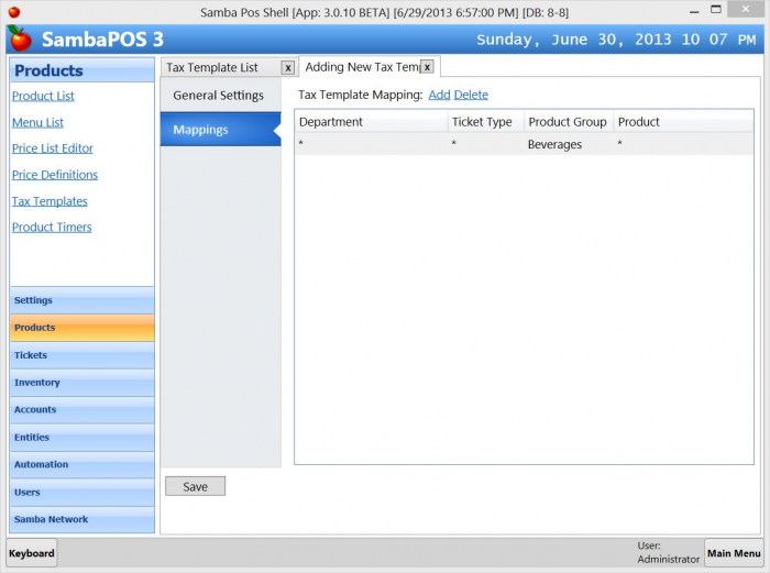 If you are familiar with SambaPOS mapping features you may think entering a default map should do the job. Since SambaPOS supports multiple taxes for a single Product we should exliciptly configure mappings. If we add default mapping and leave product group as * Beverages Tax becomes %10 + %20 because we previously configured %10 Tax for Beverages. To avoid this map each product group that have %20 Tax as shown here.